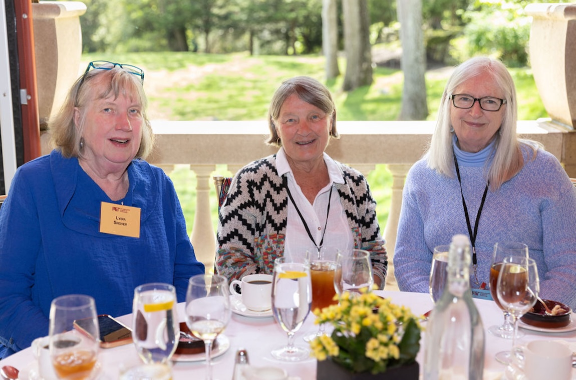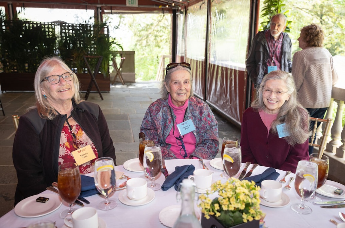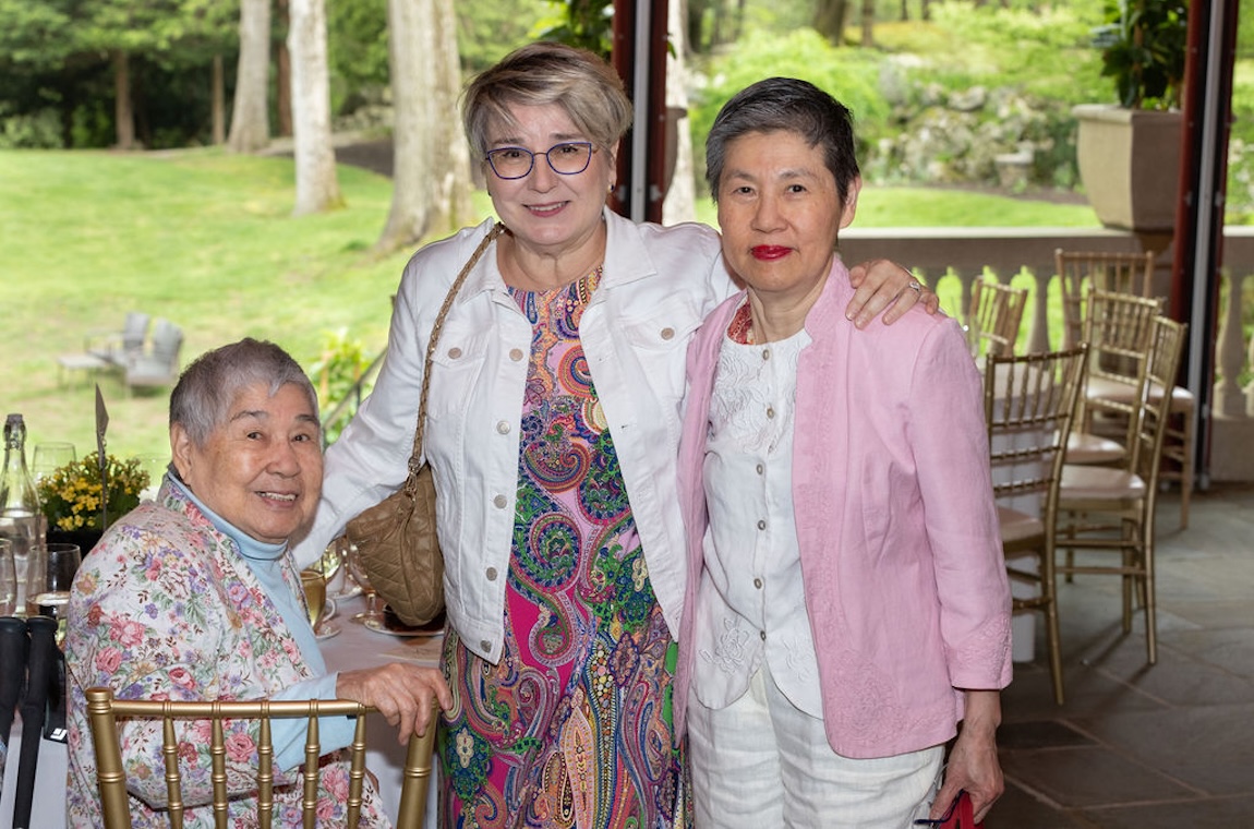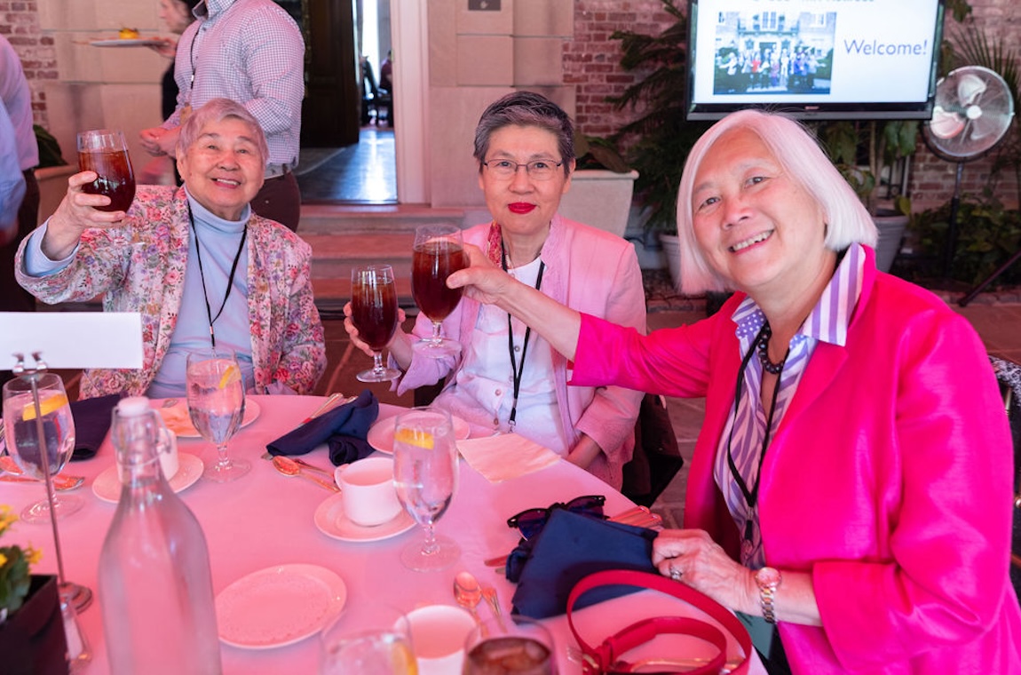 Elaine Shiang, Lily Liau, and Annie Liau toast to each other.